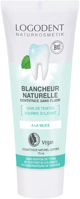 Dentifrice Logona à la silice, pour une blancheur naturelle, sans fluor. Tube de 75 ml.